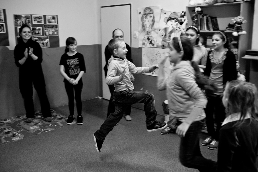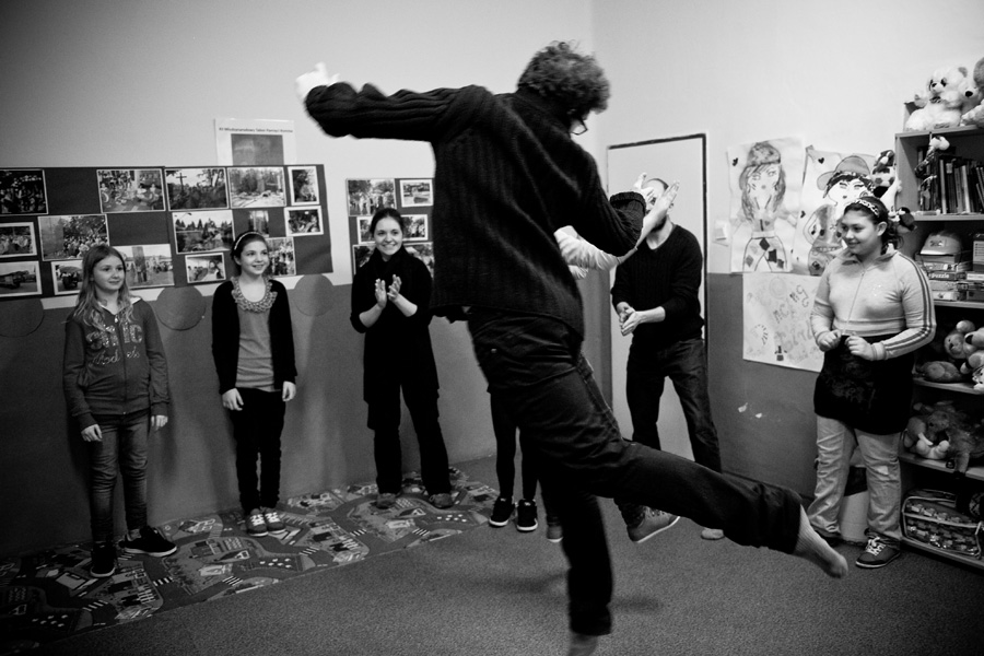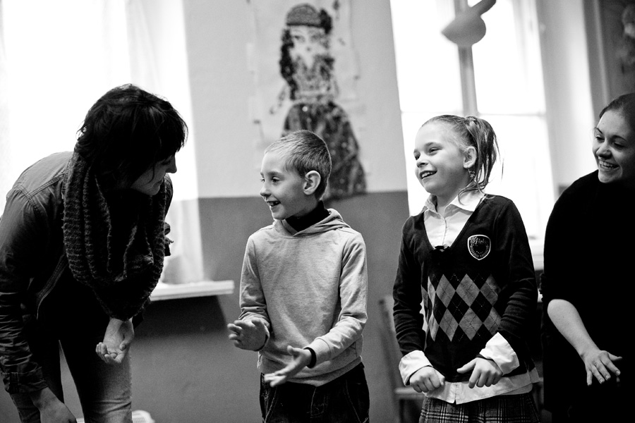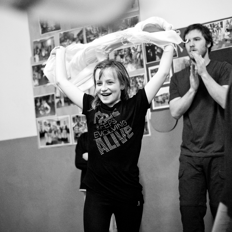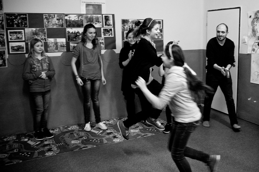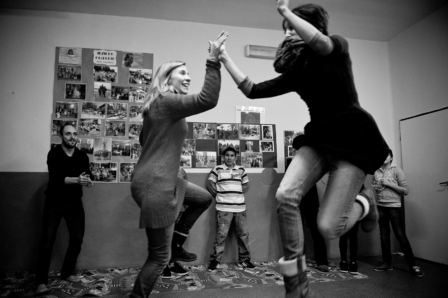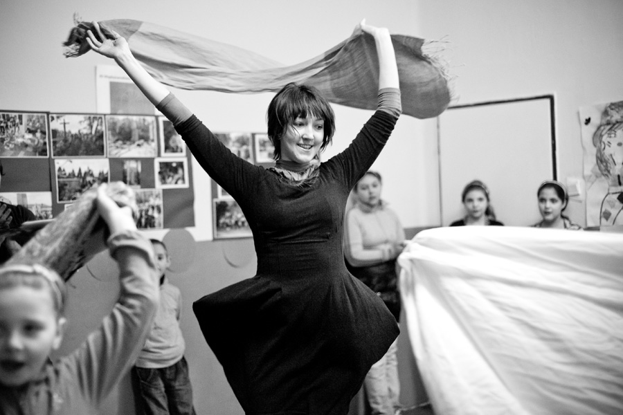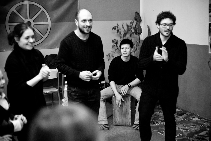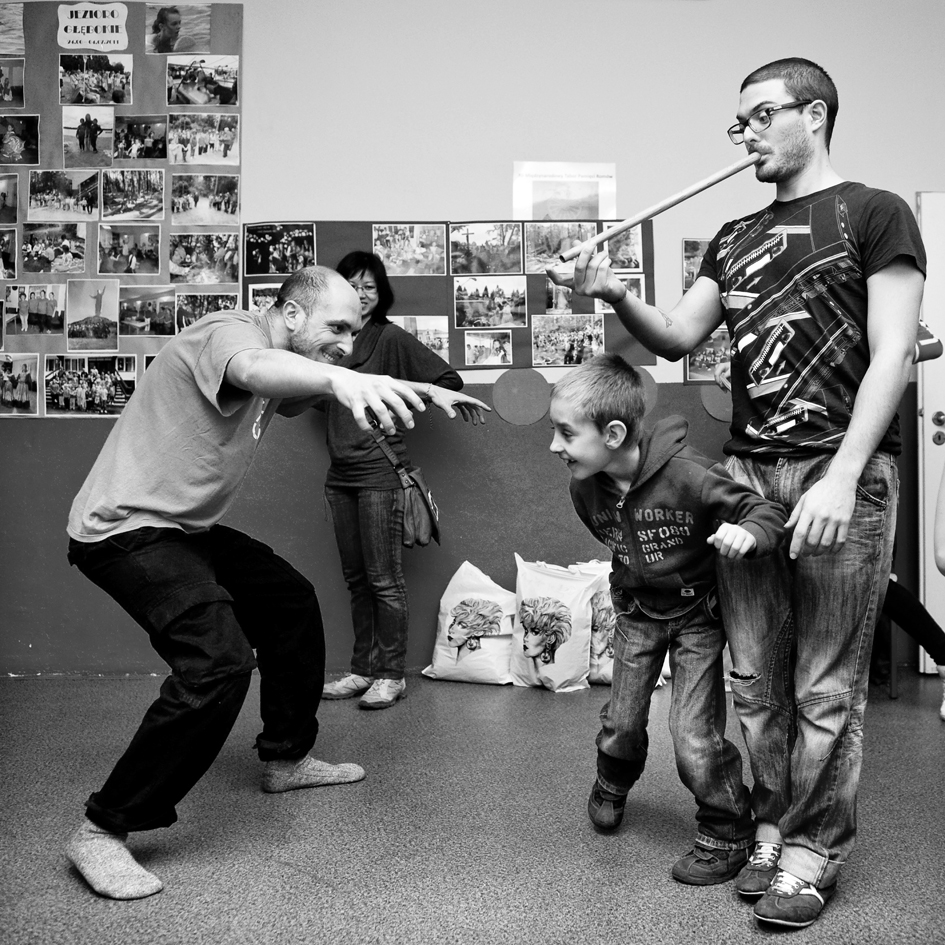 The Roma ethnic minority make up 30,000 persons within the Polish Republic, often coming from difficult social and economic situations. They have scarce opportunity for advancement due to stereotypes, lack of trust, and misunderstanding of their differing culture and way of life. Through a collaboration with Stowarzyszenie Romów we Wrocławiu Romani Bacht (Roma Association Romani Bacht), Jubilo initiated an intensive work session from November to December 2011 with a group of Roma youth in November 2011 in Wroclaw, Poland. The work sessions took place in the Brochów district of Wroclaw in a center of The Polish Association of Dyslexia. The artistic team developed a creative process to work with the Roma youth drawing from theatrical exercises, music, rhythm, and acrobatics. In addition, the artistic leaders drew on material from previous theatrical research expeditions, introducing dance elements from Italian Pizzica and Tarantella.