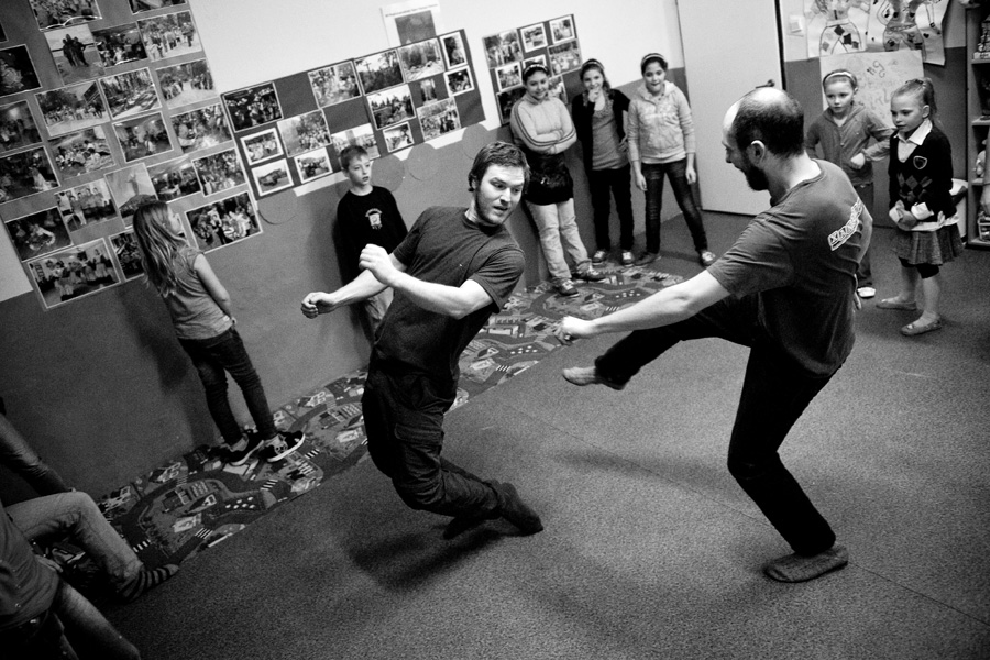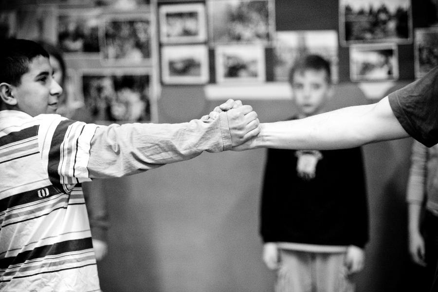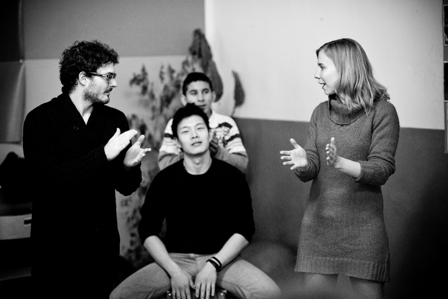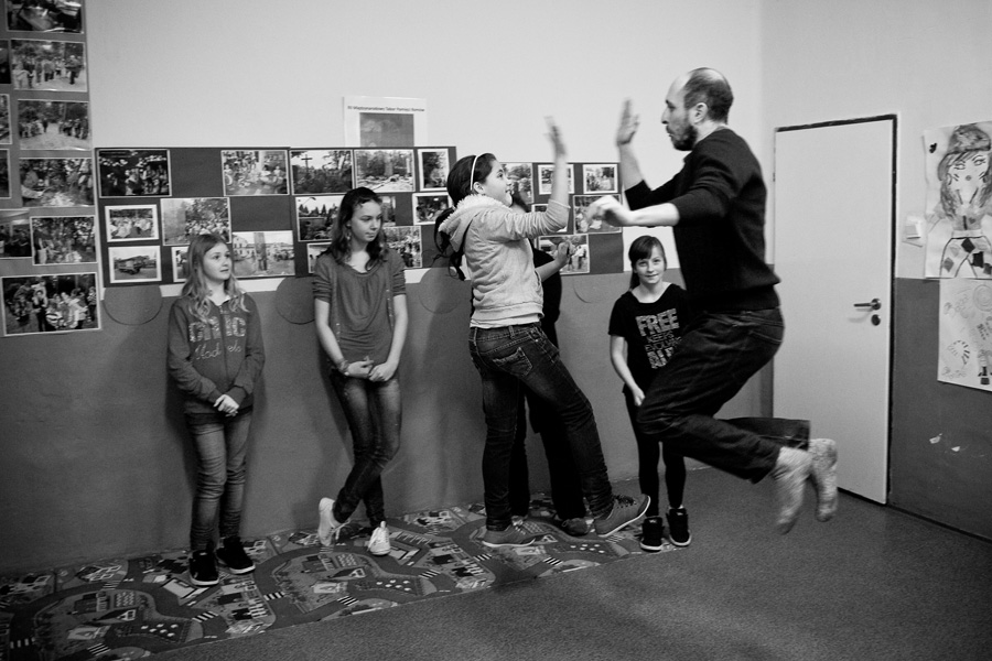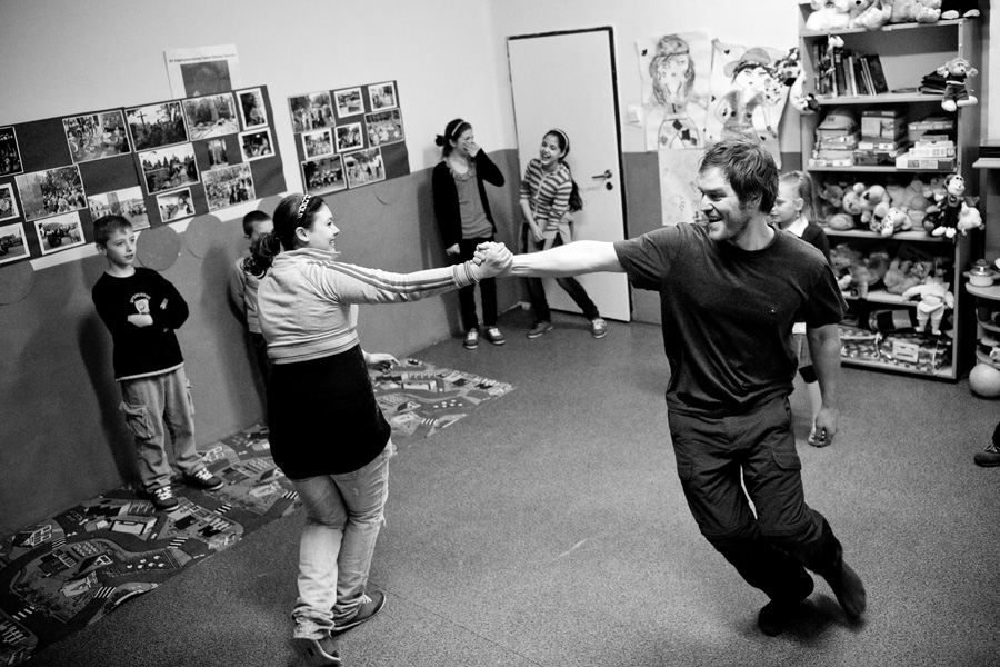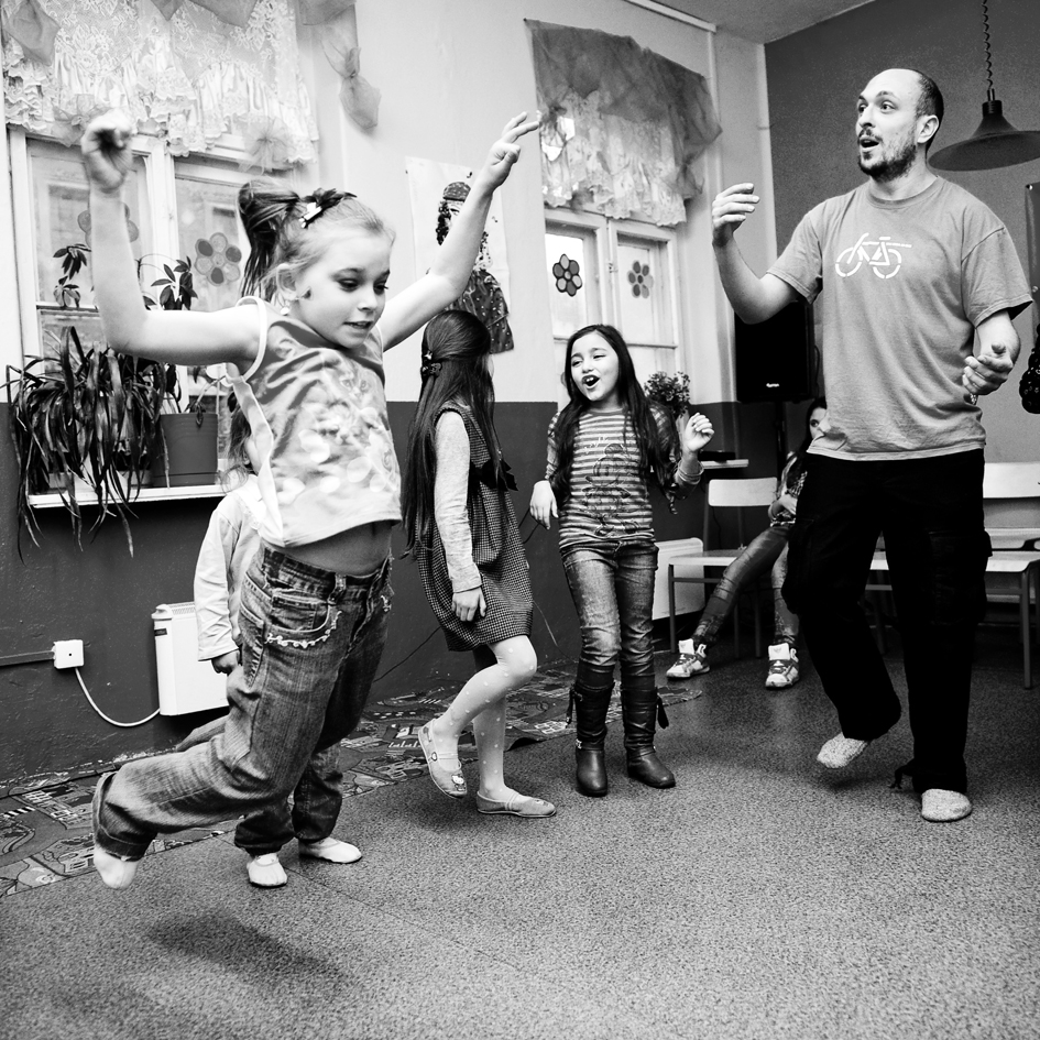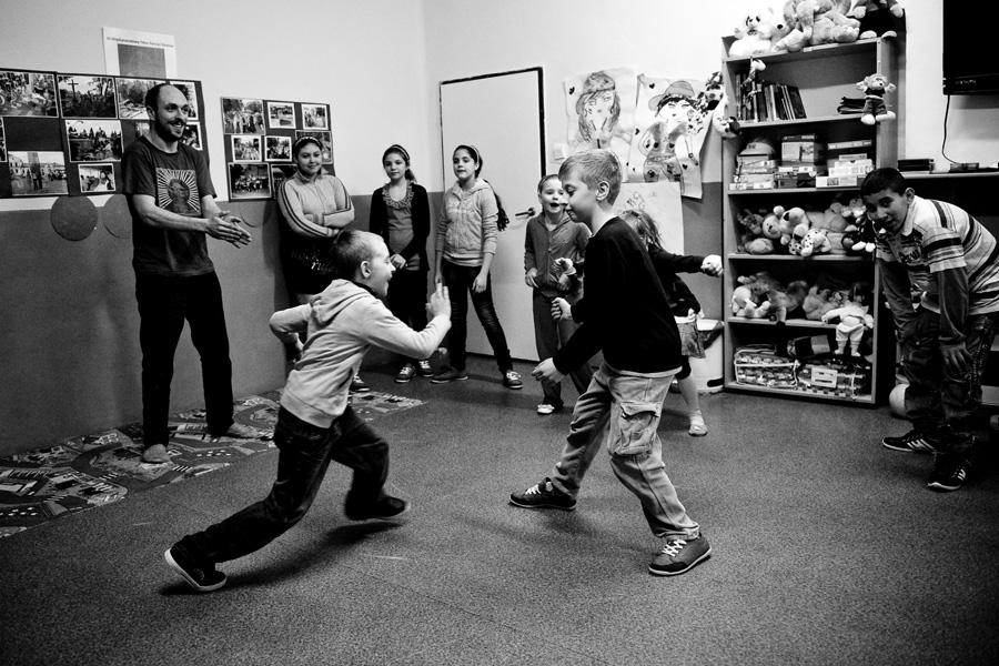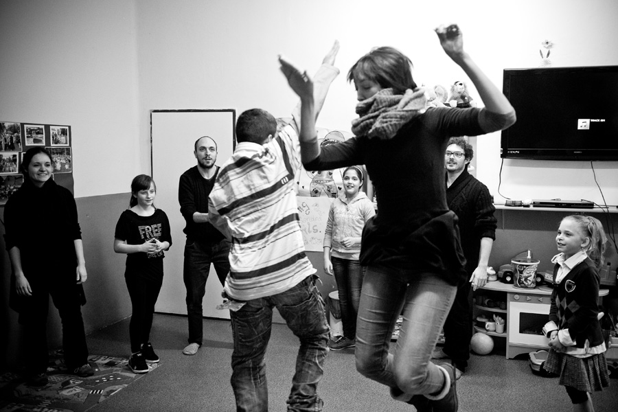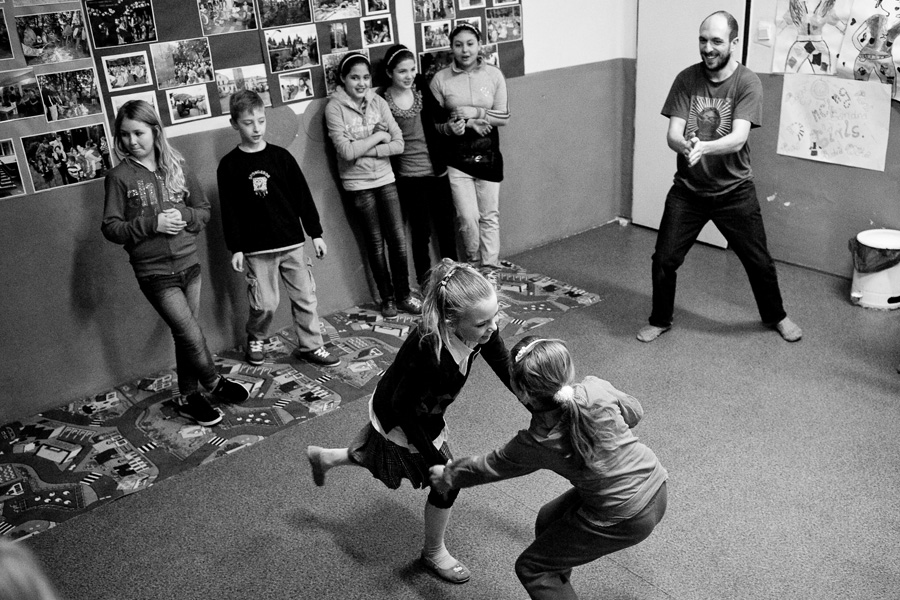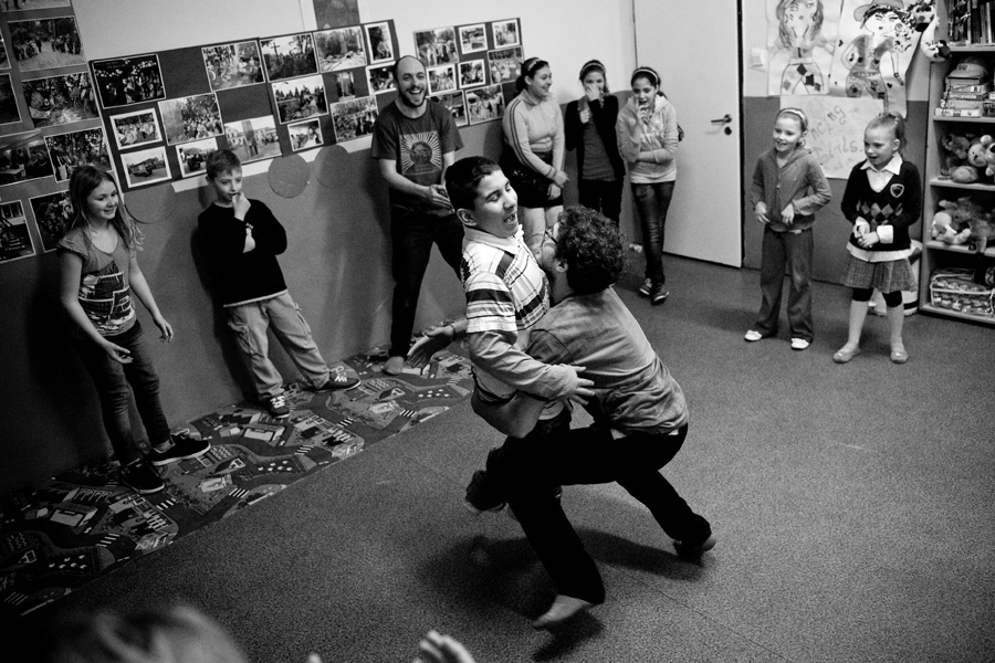 The Roma ethnic minority make up 30,000 persons within the Polish Republic, often coming from difficult social and economic situations. They have scarce opportunity for advancement due to stereotypes, lack of trust, and misunderstanding of their differing culture and way of life. Through a collaboration with Stowarzyszenie Romów we Wrocławiu Romani Bacht (Roma Association Romani Bacht), Jubilo initiated an intensive work session from November to December 2011 with a group of Roma youth in November 2011 in Wroclaw, Poland. The work sessions took place in the Brochów district of Wroclaw in a center of The Polish Association of Dyslexia. The artistic team developed a creative process to work with the Roma youth drawing from theatrical exercises, music, rhythm, and acrobatics. In addition, the artistic leaders drew on material from previous theatrical research expeditions, introducing dance elements from Italian Pizzica and Tarantella.