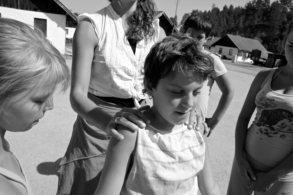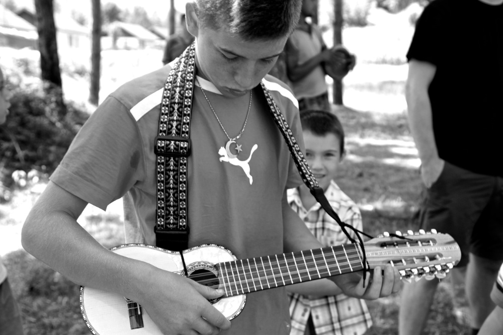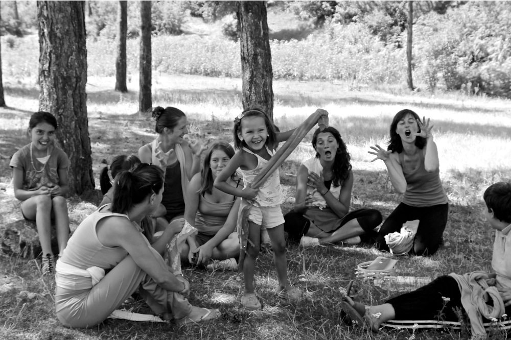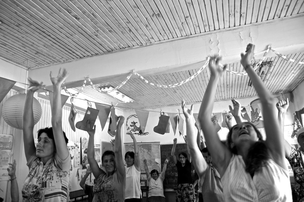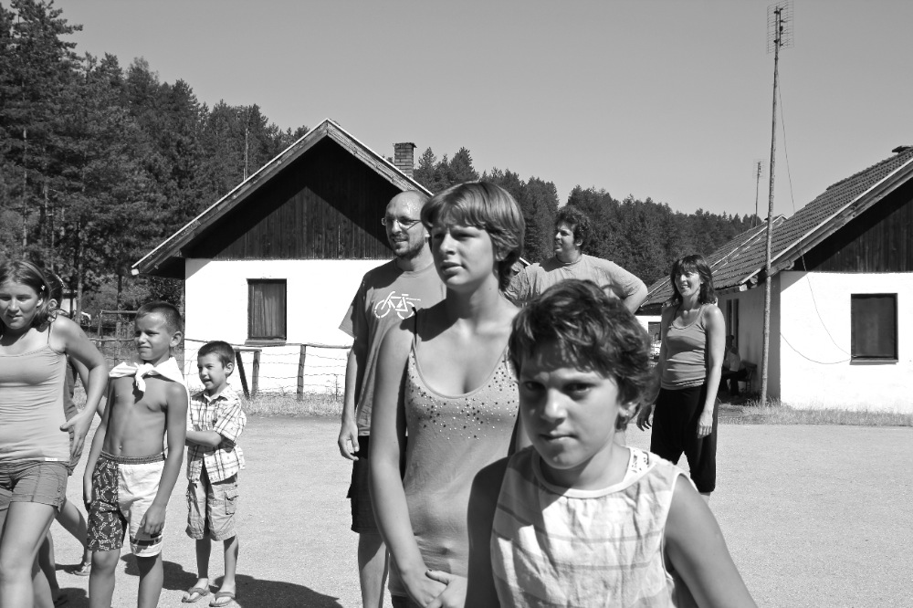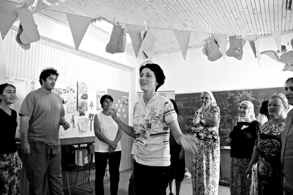 After the funeral, the artistic team traveled to the city of Tuzla, where many displaced persons still live as refugees in outlying camps. In the refugee camp of Ježevac, Jubilo worked with the association Snaga Žene (Women Power) to coordinate a series of intensive workshops through two separate artistic lines with women and children survivors of the Srebrenica genocide. The work with the women focused on opening body awareness and imagination, using elements of simplified Ashtanga Yoga, movement, visualization, singing, and drawing. The song material used in the work sessions also included bosniak lullabies from the women’s culture. The children’s workshops drew on elements of acrobatics, rhythm, percussion, theatrical games, and dance elements of Italian Pizzica. The expedition and workshops will be presented in a future documentary film currently in production. The project was realized with the support of the European Cultural Foundation Step Beyond Grant.