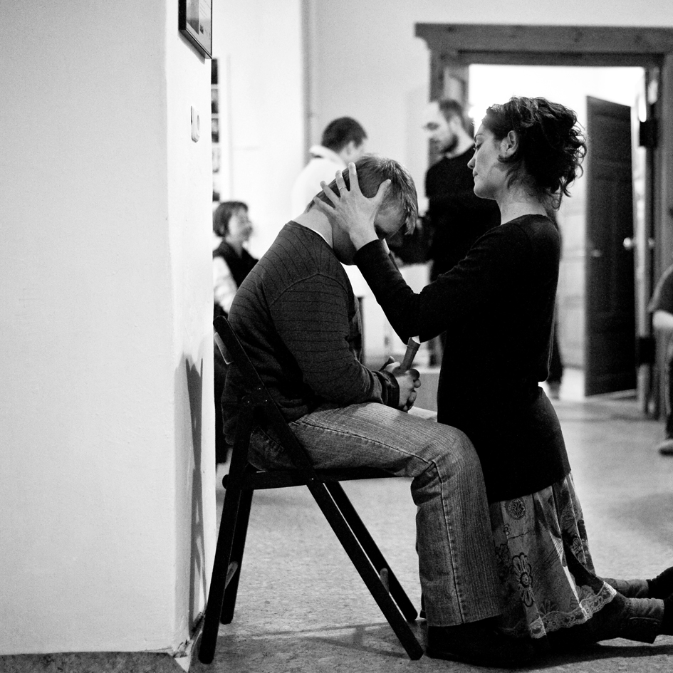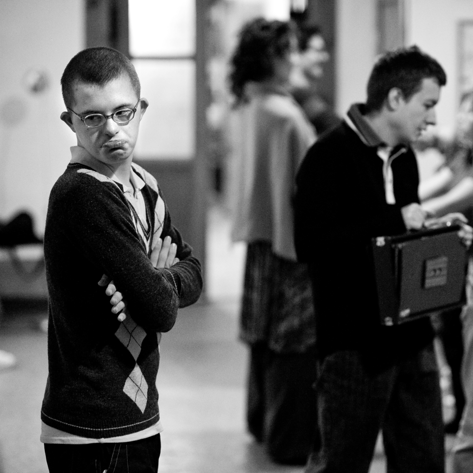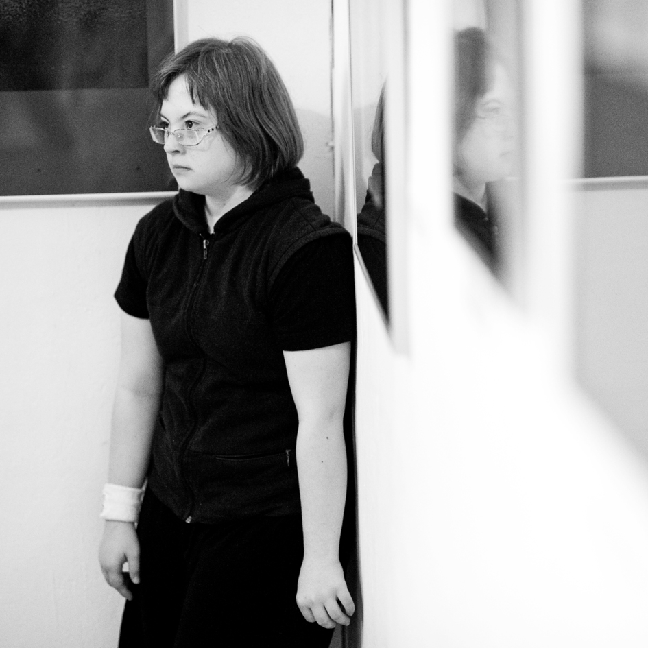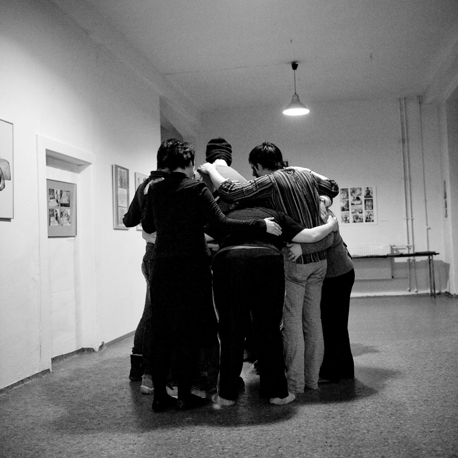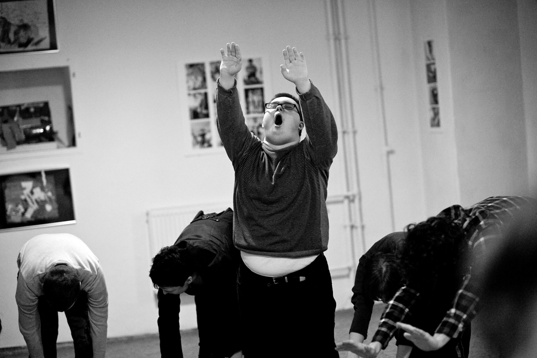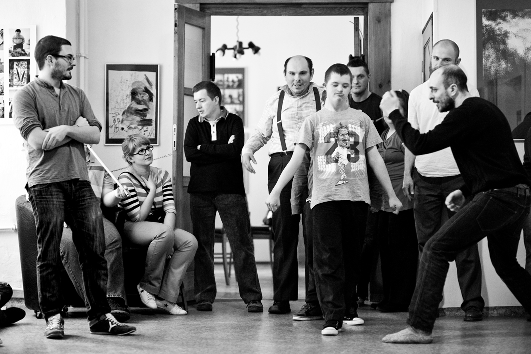 The members of Świat Nadziei stepped onto this platform and gradually discovered their voices, from proposing their own yoga exercises to writing poetry to dancing to playing musical instruments. In addition to the performance workshops, Jubilo held a series of photography workshops, where the members of Świat Nadziei explored the camera as a tool of creative expression. The work culminated in a final presentation to the Wrocław public in May 2012 entitled ‘Searching for the Language of Joy.’ The presentation was held in the theatre space of Teatr Pieśń Kozła (Song of the Goat Theatre) along with screenings of documentary films, a photography exhibition, and sketches of the rehearsal process by local artists from The Academy of Fine Arts in Wrocław.